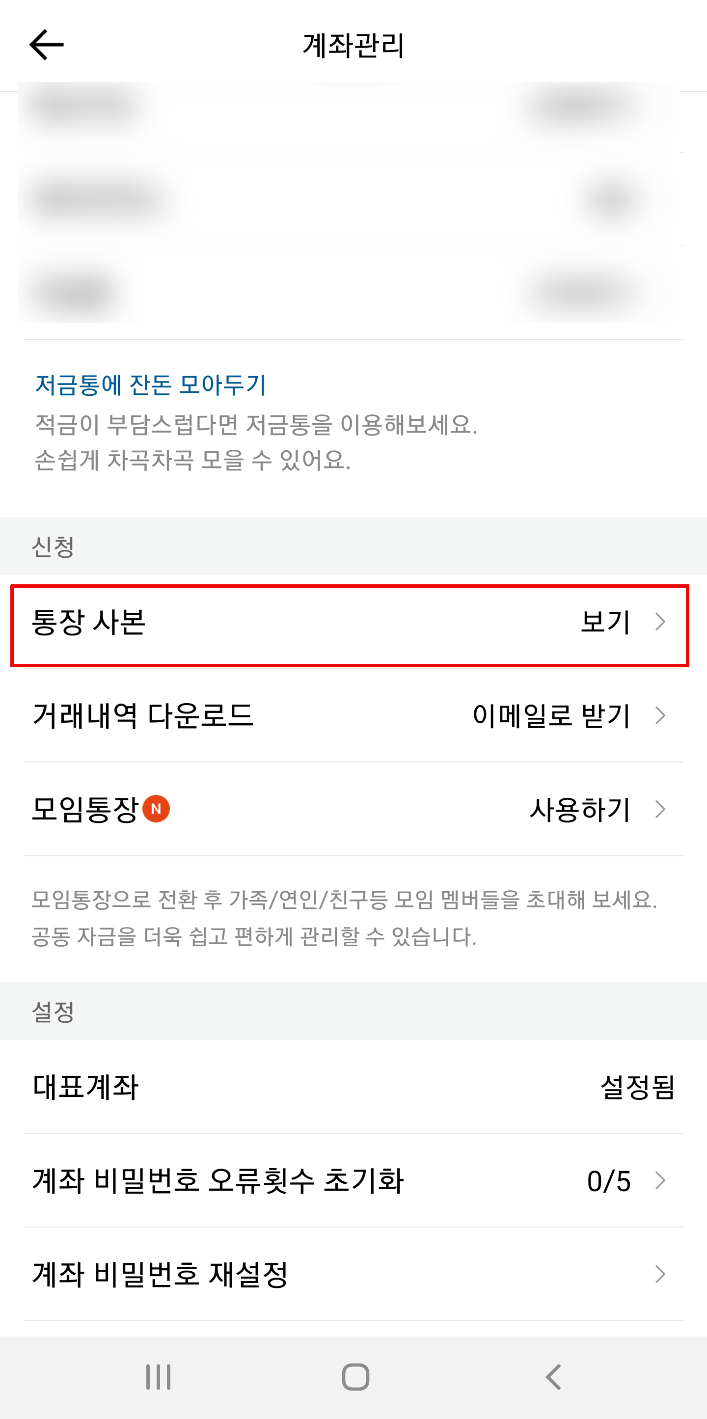 통장의 관리 버튼을 터치하면, 위와 같이 해당 통장을 관리하는 화면이 나오는데, 첫화면에서 조금 내리다 보면 중간쯤에 '통장사본'항목이 있고, 우측에 '보기'버튼이 있다.