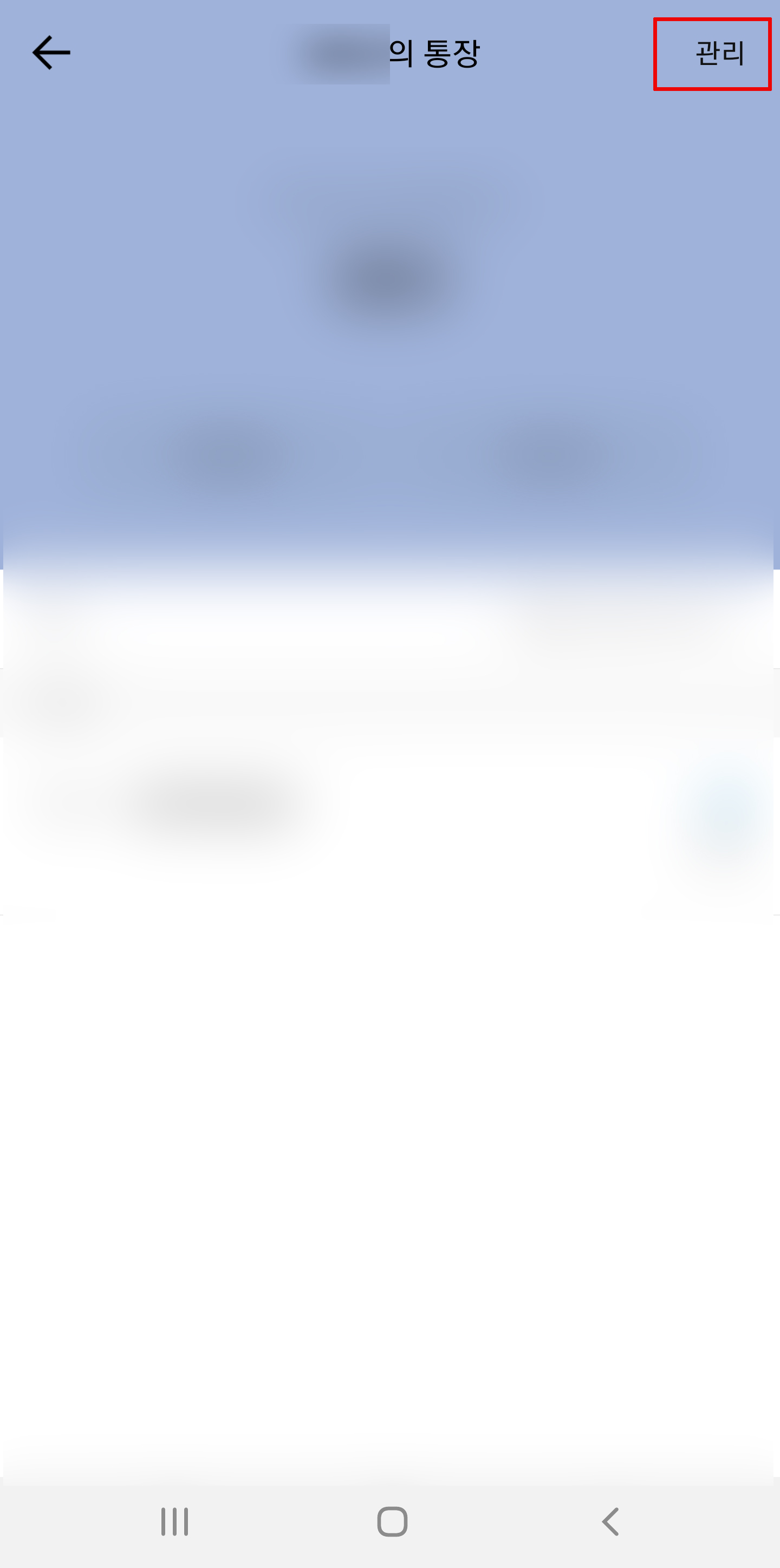 통장을 선택하면 잔액과 최근 내역들이 나오는데, 우측 상단의 '관리'버튼을 터치한다.