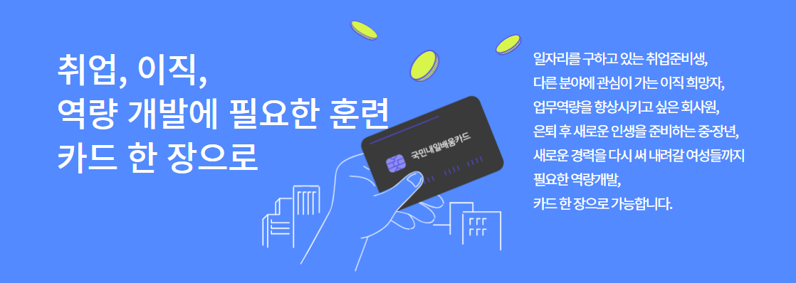 국민내일배움카드는 일자리를 구하고 있는 취업준비생이나, 다른 분야에서 일하고 싶은 이직희망자등이 직무능력이나 필요한 역량을 배우고 향상시킬 수 있도록 국비를 통해 훈련비를 지원해주는 제도이다. 또한 취업이후에도 필요한 역량이나 현장업무등을 배울 수 있다.