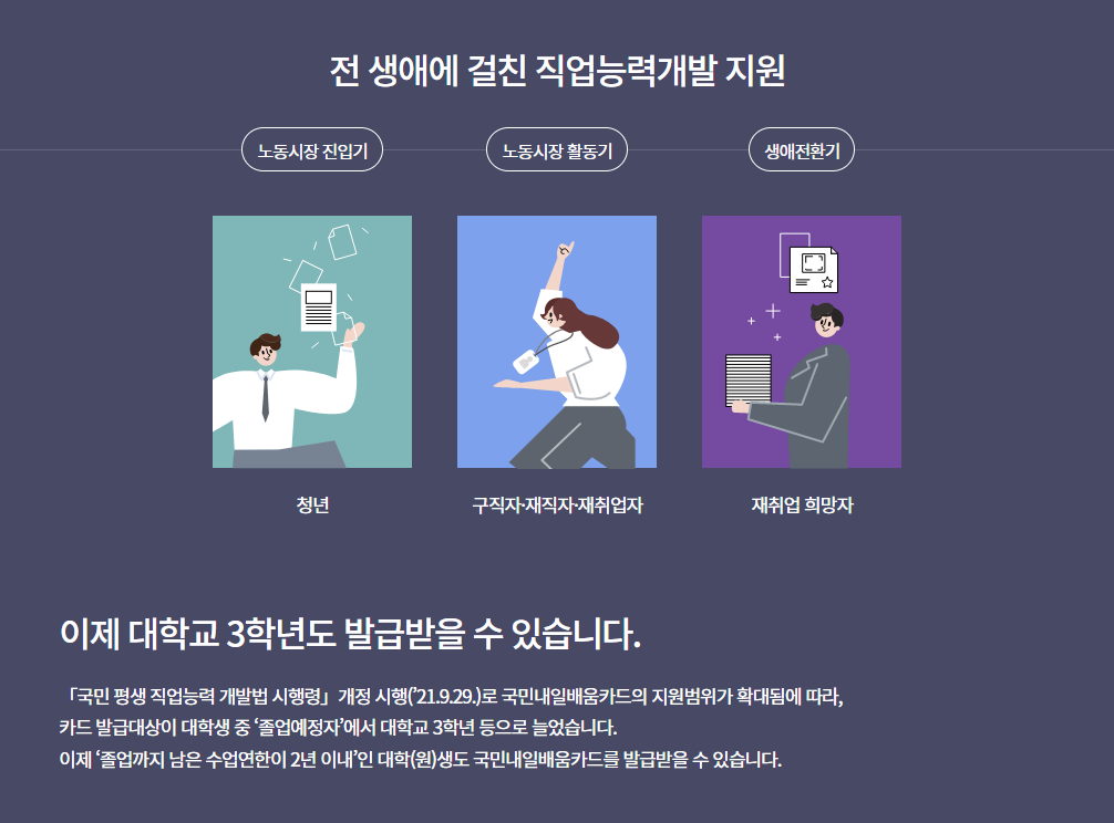 또한, 기존에는 대학생의 경우 4학년인 '졸업예정자'부터 국민내일배움카드 신청이 가능하였지만, '국민 평생 직업능력 개발법 시행령' 개정으로 졸업까지 남은 수업연한이 2년 이내인 즉, 대학교 3학년 학생도 신청이 가능하도록 범위가 확대되었다.